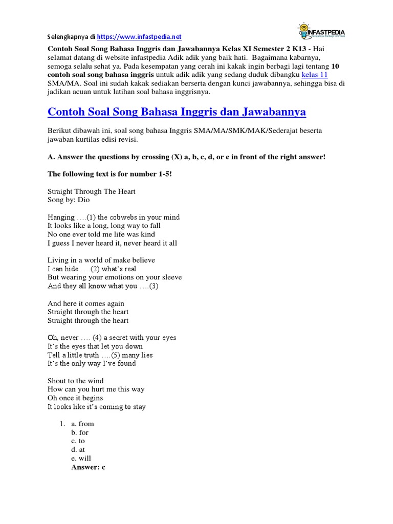 Contoh Soal Song Bahasa Inggris Dan Jawabannya