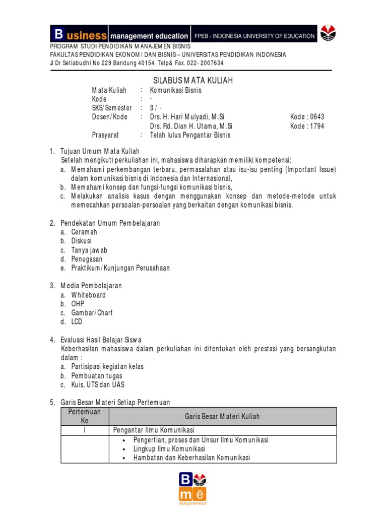 Contoh silabus dan rpp smk sekolah menengah kejuruan kelas x xi xii semester 1 dan 2 silabus dan rpp smk berkarakter kelas x xi xii tahun 2016 2017. Departemen manajemen bisnis gedung manajemen bisnis kampus its jl raya its sukolilo surabaya telp: 2 no pertemuan bahan kajian 1 i memahami komunikasi bisnis a.