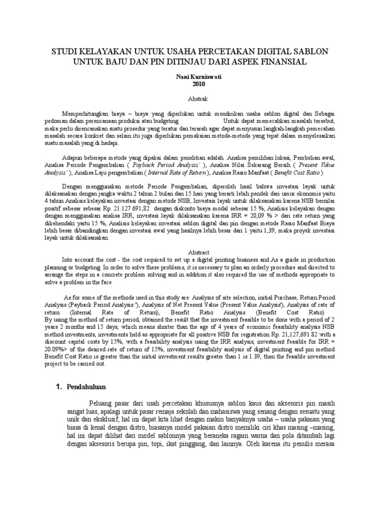 Peran studi kelayakan bisnis dalam peningkatan… bisnis, vol. Studi kelayakan bisnis di zaman yang semakin maju ini, lapangan pekerjaan semakin sempit dan susah sekali untuk mendapatkan pekerjaan. Berbagai konten premium jurnal hanya untuk anda.